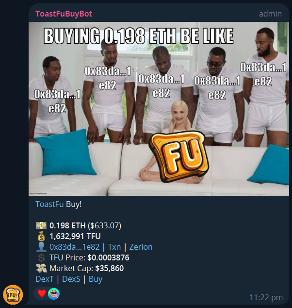 ToastFu's Meme Buybot is the first buybot to generates memes for each buy using the buyer's address or Ethereum Name Service (ENS) name, ETH buy amount, Token name/logo.&#x20;